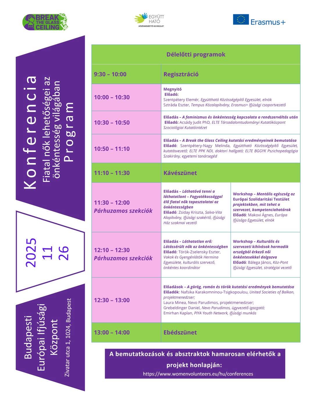 BREAK THE GLASS CEILING zárókonferencia a női önkéntesség témájában, 2025. november 26-án 10:00–17:00-ig a Budapesti Európai Ifjúsági Központban (Budapest, Zivatar u. 1-3, 1024.)
